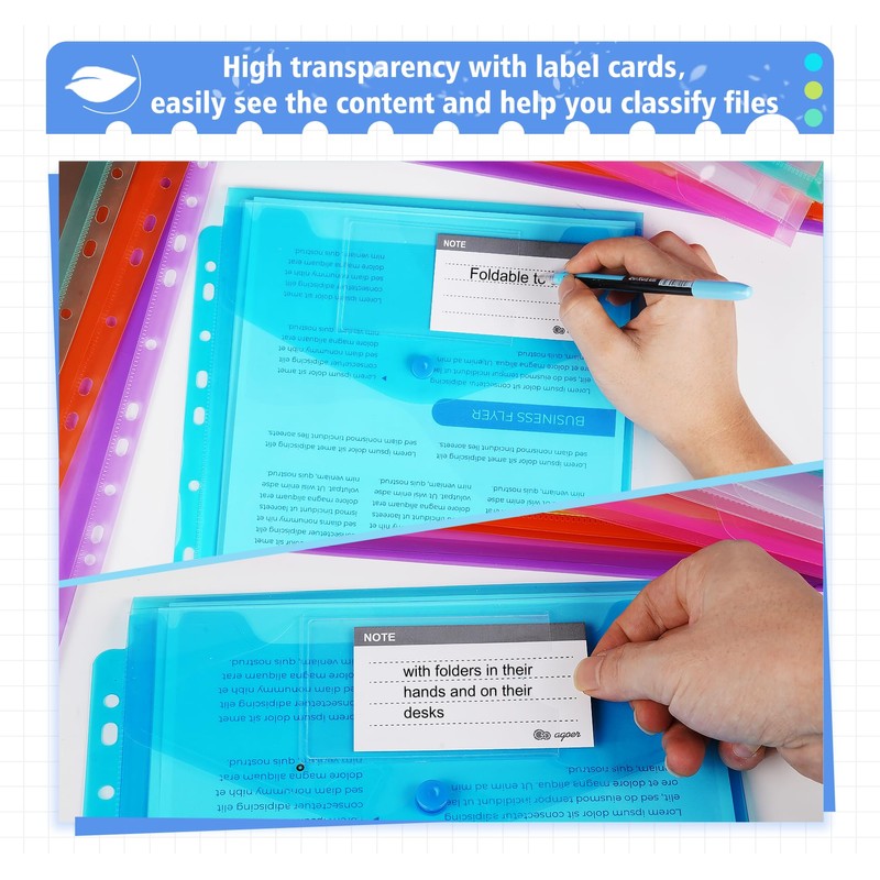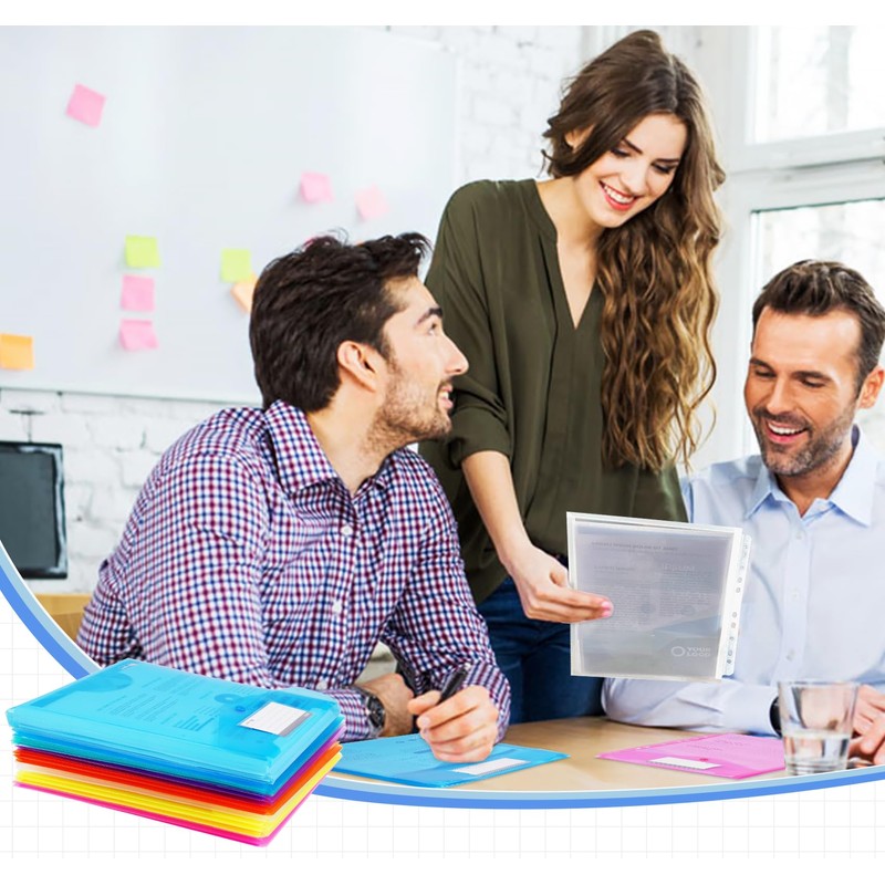 - 【Premium Quality】Our Multicolor Punched Pockets A4 plastic wallets with popper are made from thick polypropylene with a secure snap button,DURABLE,WATER RESISTANT AND NON-TOXIC.This plastic envelope A4 are MORE THICKER,TOUGH,SOFT AND FLEXIBLE, perfectly protect your files from damage.These pockets are designed for repeated use, offering a cost-effective solution to streamline your storage and organization needs.