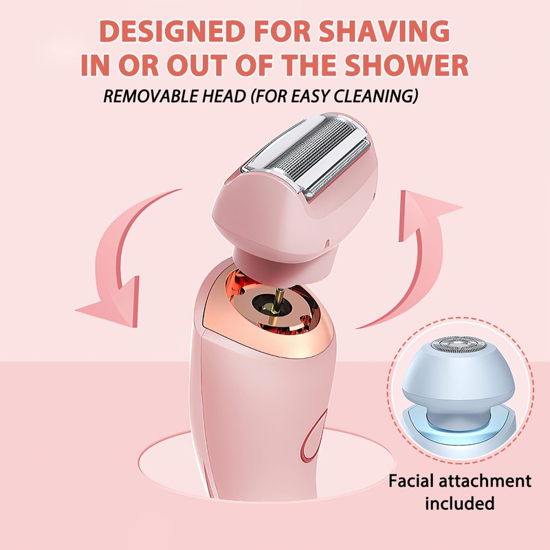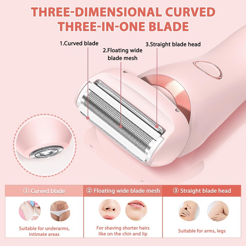 - Multi-function Electric ShaverThree-blade design can effectively remove hair from various parts of the body. The straight blade is perfect for arms and legs, the curved blade expertly handles underarms and the bikini area, while the 3D floating foil targets shorter hairs