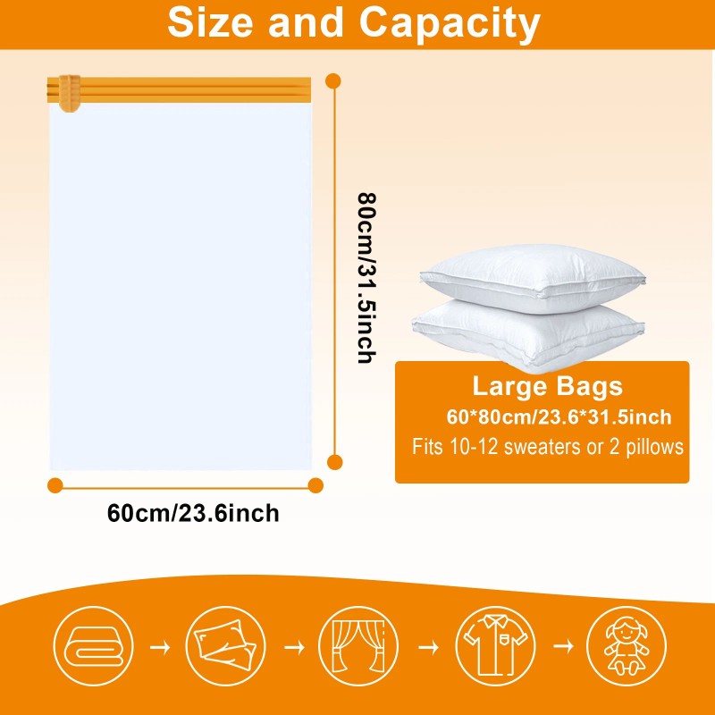 - Versatile Solution for Space Saving: Our vacuum storage bags are an essential item for home organization and travel. Store everything from clothing, duvets, pillows, and towels. Compared to regular bags on the market, our vacuum bags save up to 80% more space, freeing up room in your closet, suitcase, bedroom, basement, dorm, and attic.(No Pump Include!!)