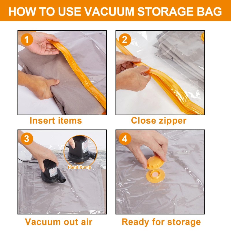 - Fast Vacuum and Easy to Use: Our vacuum bags are compatible with standard hand pumps, and electric air pumps (none of which are included). Simply put the items in our storage vacuum bag, seal the zipper, suck out the air, close the lid, and you're set for convenient storage of your belongings.