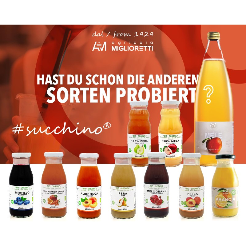 - 100% organic juice of orange, carrot and apple, cold pressed, without adding water or sugar: only selected fruits, carefully processed to preserve taste and nutrients