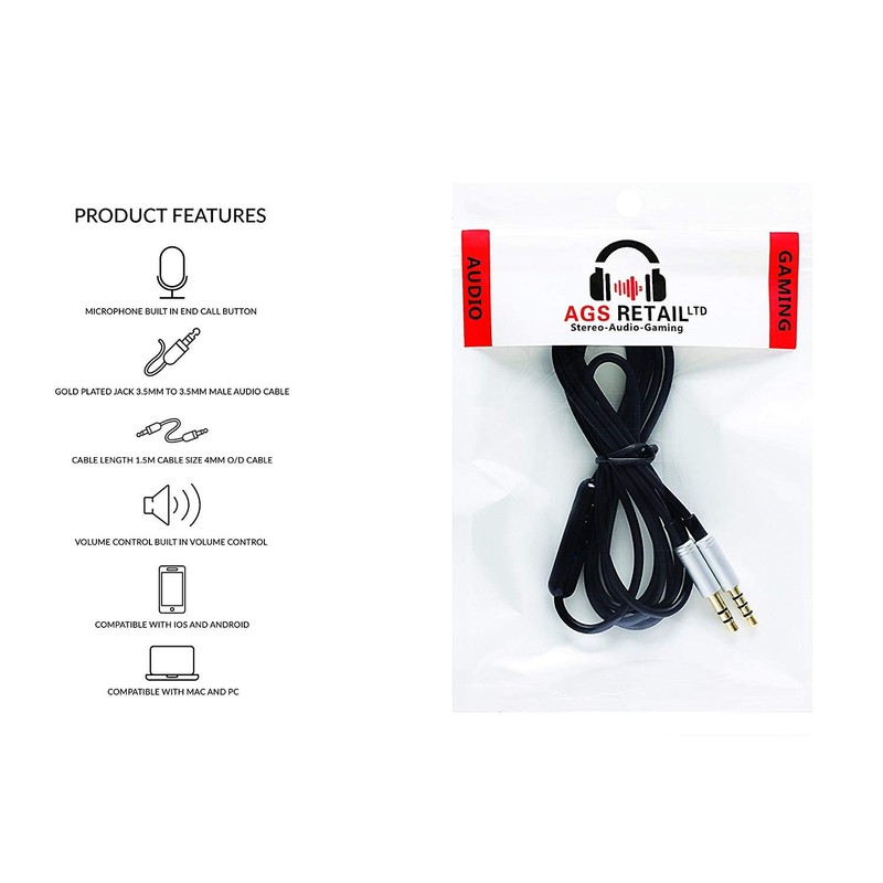 - PRODUCT SPECIFICATIONS: The AUX cable is 1.2 m long. It is available in a Black colour with a jack measuring a standard of 3.5mm/3.5mm in size. Brand New Item, Comes in AGS Retail Ltd. Branded Packaging. Click ‘Add to Basket’ Now!