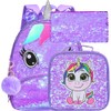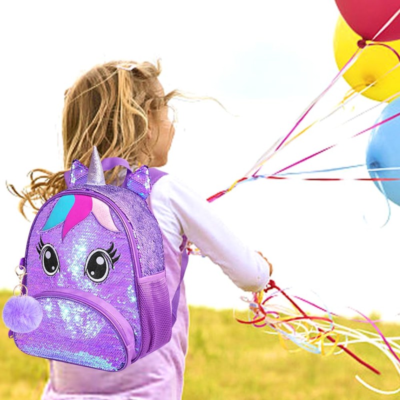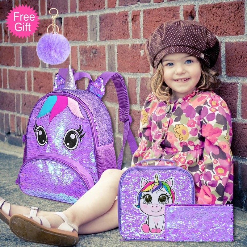 AGSDON 3PCS Toddler Backpack for Girls, 12" Unicorn Sequin Preschool Bookbag and Lunch Box - Purple