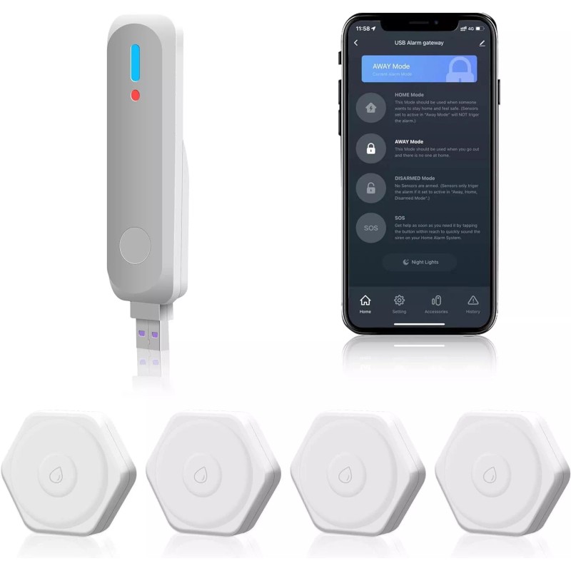 Package include1 gateway and 4 mute water sensors1 gateway and 5 water sensors2 water sensors1 gateway and 2 water sensors1 gateway and 5 water sensors