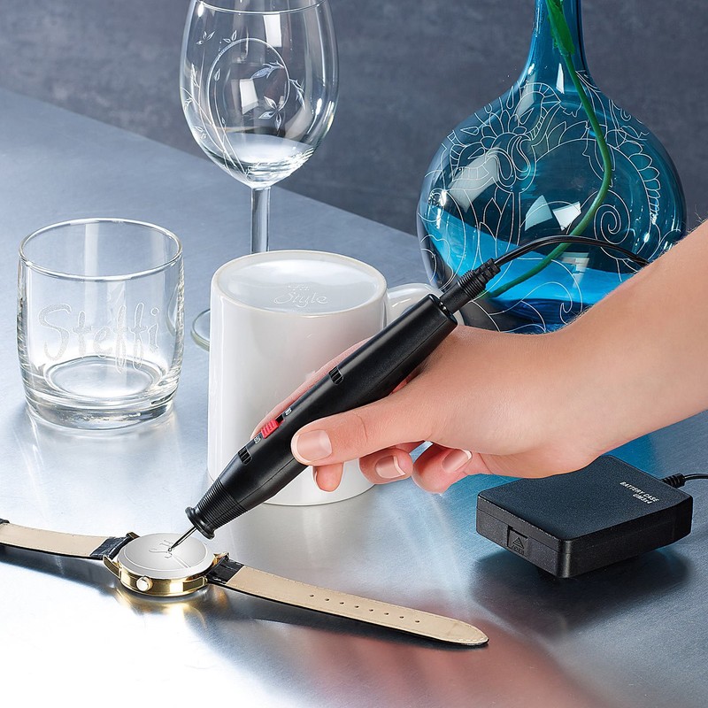 Endlich gelingen jedem schöne Gravuren ganz einfach zu Hause. Und das auf nahezu jedem harten Material wie Glas, Stein, Metall, Kunststoff oder Keramik.