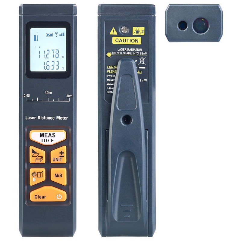 - Measuring distance: 5 cm to 30 m, accurate to 1.5 mm. Measurement from the front or rear edge of the device. Addition and subtraction calculation: measure entire rooms in one go. Selectable measurement units: m, in, ft. Laser of class 2: 639 nm, max. 1 mW