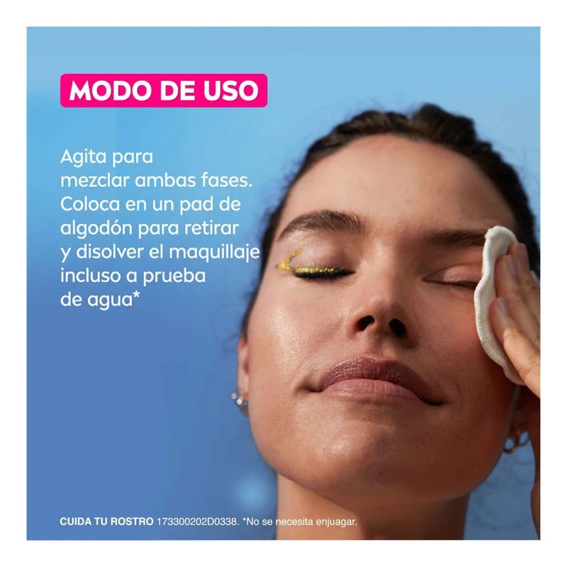 Remueve maquillaje a prueba de agua, impurezas y suciedad fácilmente sin necesidad de frotar. No deja residuos grasos. Apto para piel sensible. Dermatológica y oftalmológicamente aprobada.