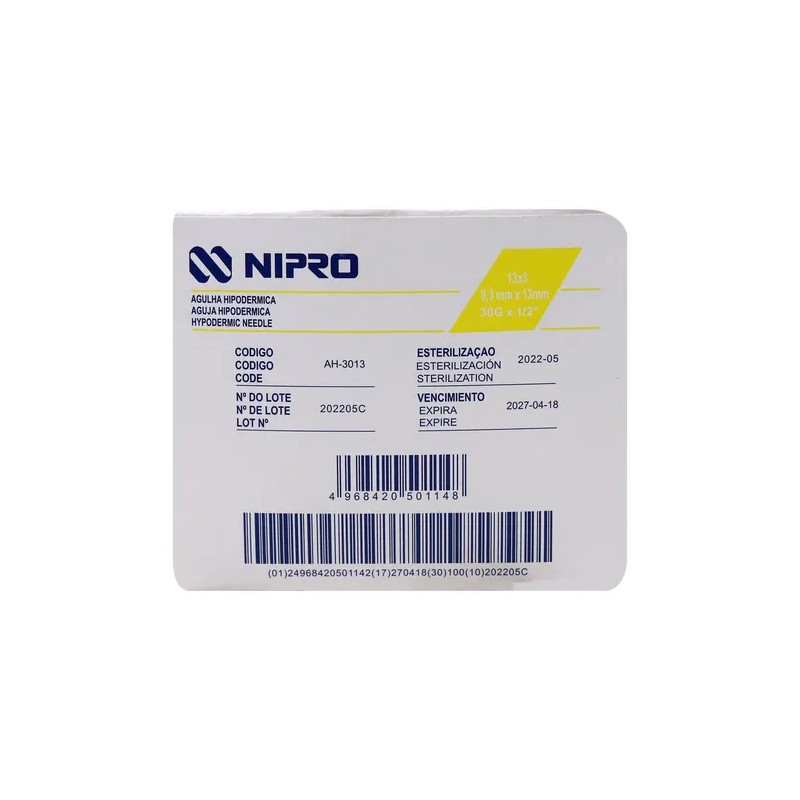 Aguja Hipodermica 30g X 1/2 (13mm) Caja Con 100 Pz Nipro Capacidad en volumen 13 mL