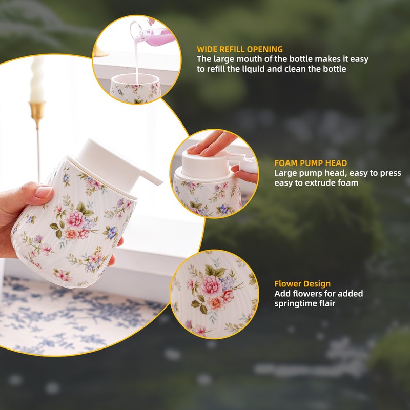 Agyiuns Ceramic foaming soap Dispenser with Easy-to-Press Pump for Bathroom 12 oz refillable for Hand sanitizers, lotions (Foam-Little Flowers)