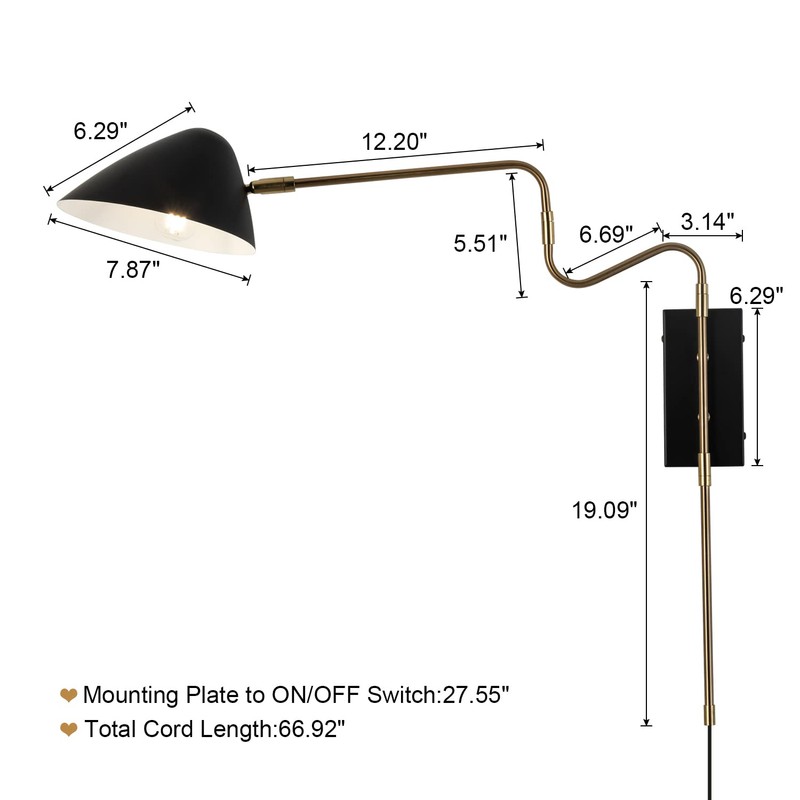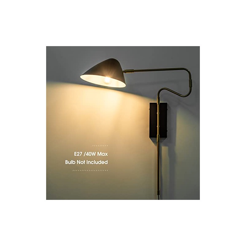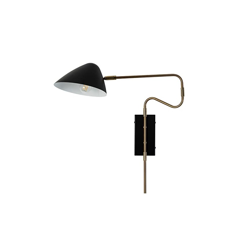 - Modern & Sleek: A plug in sconce with simplicity black finisshed metal crafted shade, wall mounting plate and pare with brass swing arms, features a great contemporary wall lighting choice for bedside, workspace and living room.