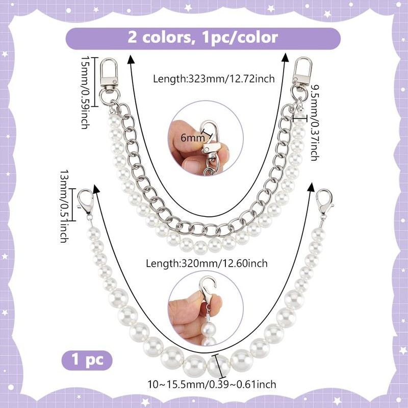 - Size Detail:The first two chains measure 32cm in length featuring 9.5mm pearls with 13x9.5x2mm links and secure 36x15x5.5mm clasps, while the third chain offers a 32cm length with graduated 10-15.5mm pearls and a 23x13x4mm clasp, This bag extender chain provides ideal dimensions for both stylish decoration and practical handle replacement