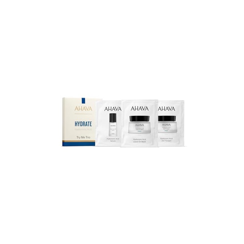 AHAVA Hyaluronic Acid Hydrate Sachet Kit - HA Serum, Leave on Mask & 24/7 Face Cream, Boosts Hydration, Long Time Wrinkle Prevention, Softens & Refine Skin's Texture with Osmoter and ATPeptides | 3ml