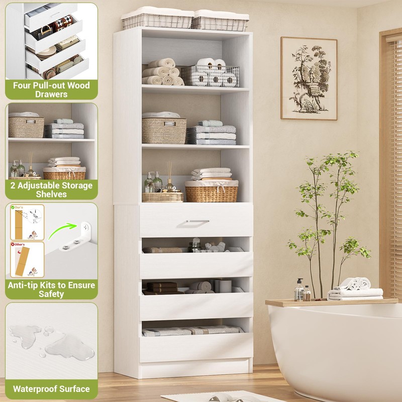 Aheaplus 21.3" Closet System with 4 Drawers, Wood Closet Organizer with Open Shelves, Modular Drawers System Tower, Walk-in Closet Small Wardrobe Rack, Tall Storage Cabinet Unit, White