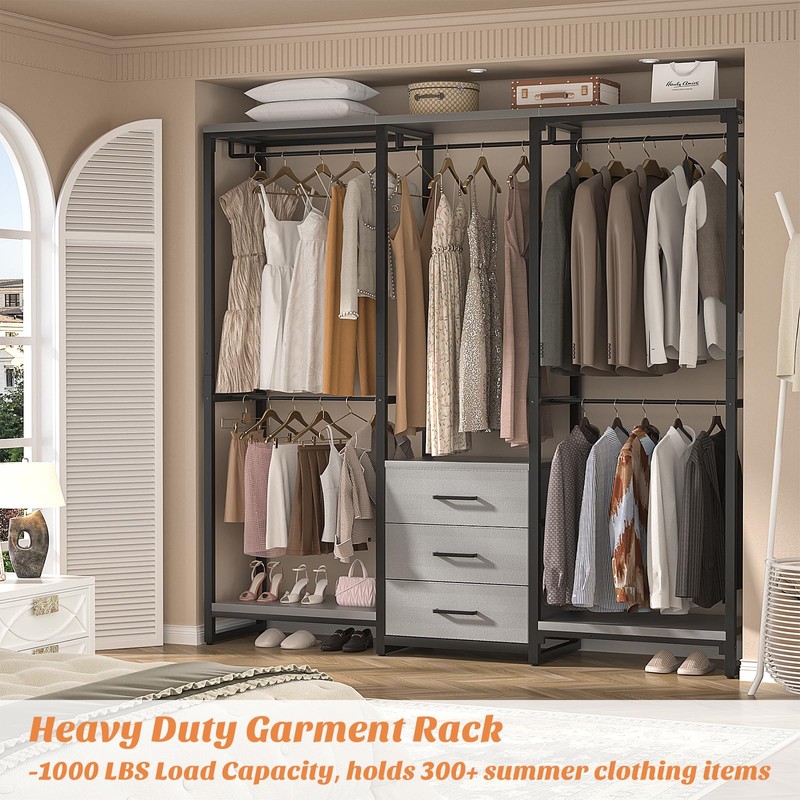 - 【Closet Organizers with Ample Storage Space】With a robust weight capacity exceeding 1000 lbs and accommodating up to 350 pieces of summer clothing, this heavy-duty closet organizer boasts 5 hanging rods capable of supporting various garments like dresses, T-shirts, suits, and jackets. Additionally, it offers ample space for storage boxes, shoes, folded clothes, and bedding, ensuring all your essentials are neatly arranged. Load capacity up to 1000 lbs+.