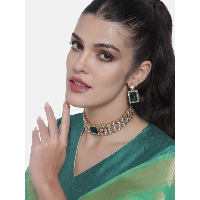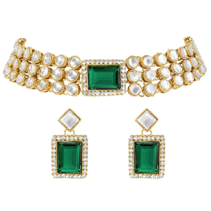 Aheli Ethnic Choker Necklace Earrings Wedding Bollywood Party Jewelry Set for Women (Green Square-Three Layered)