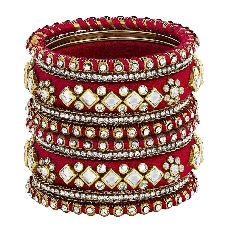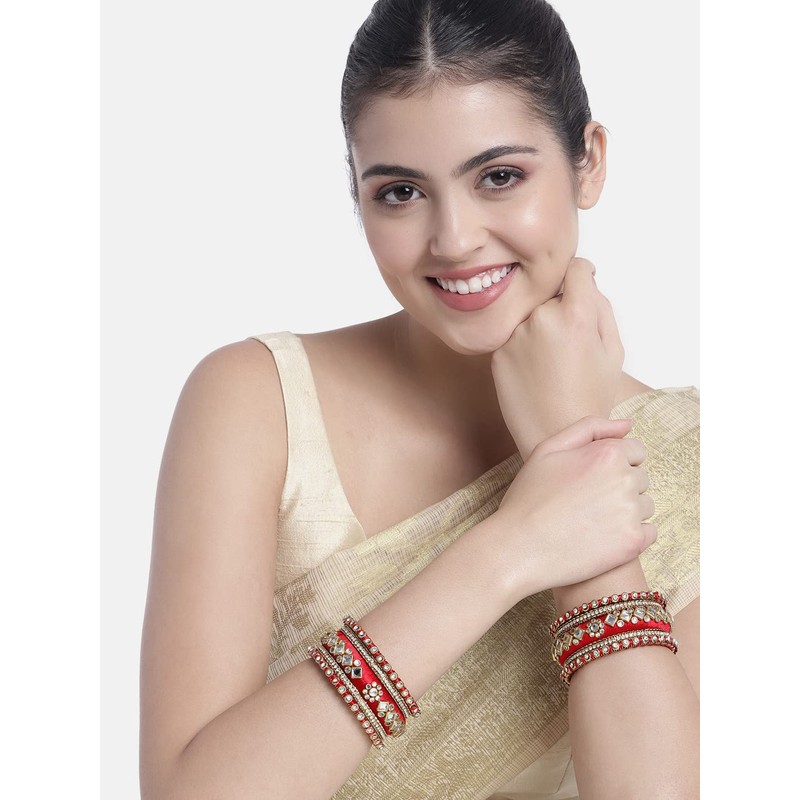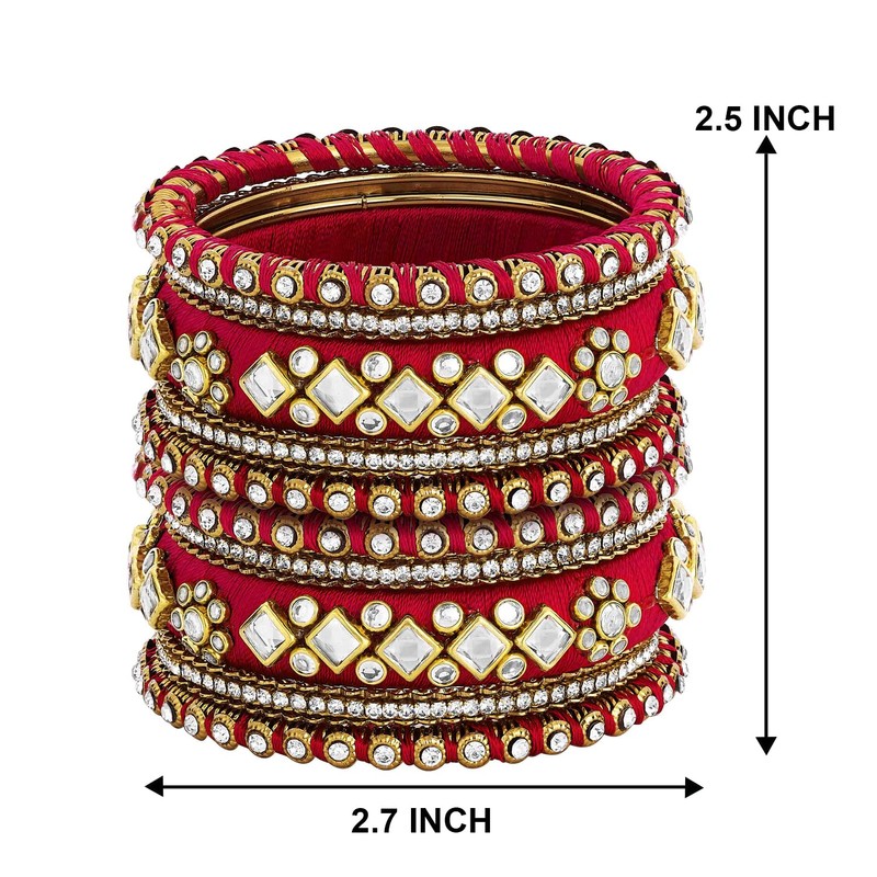 Aheli Red White Silk Thread Fabric/Stone Studded Kundan/Chura/Chuda Bangle Set Gift for Women Size 2.6"