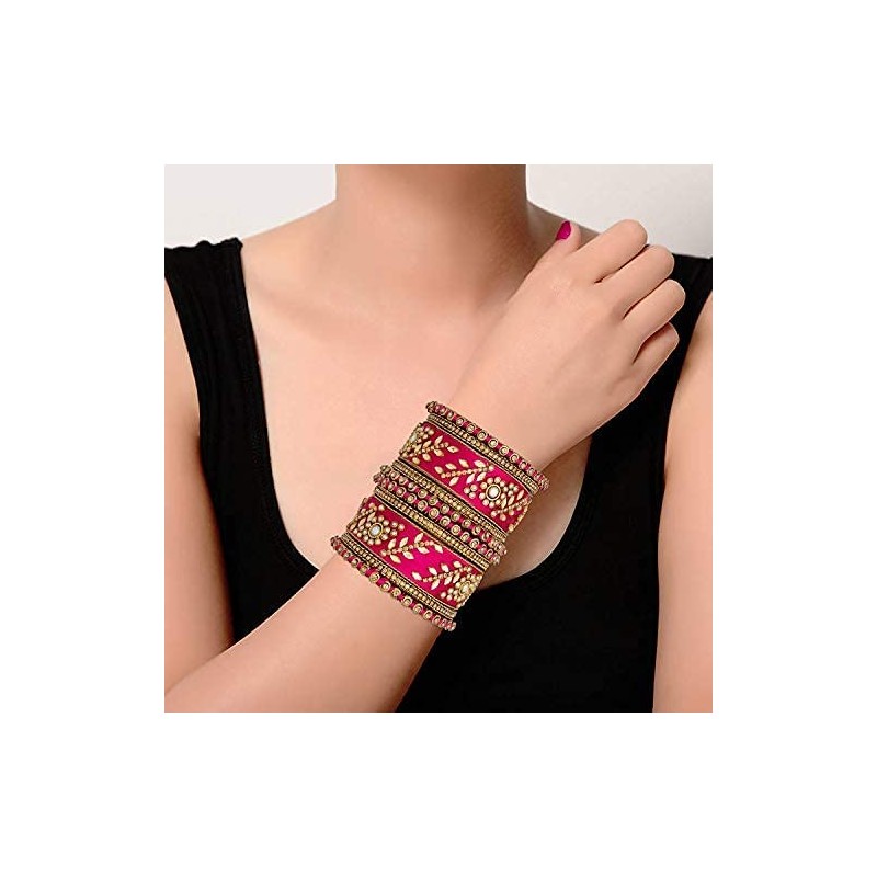 Aheli Traditional Wedding Designer Silk Thread Faux Stone Studded Bridal Bangle Set Chuda Indian Ethnic Bollywood Fashion Jewelry Gift for Women Magenta Size 2.8"