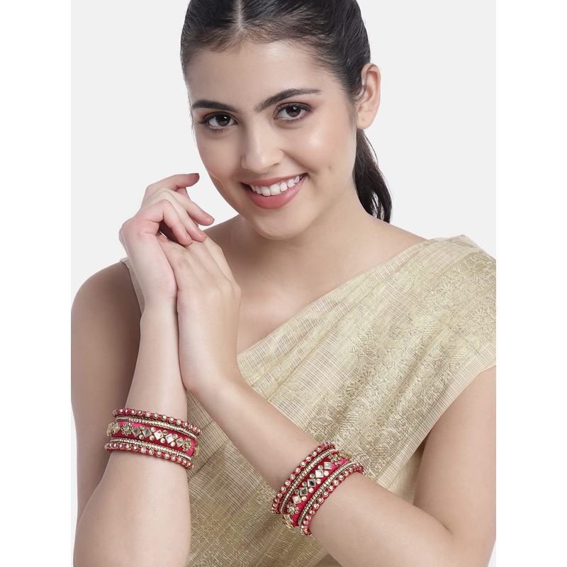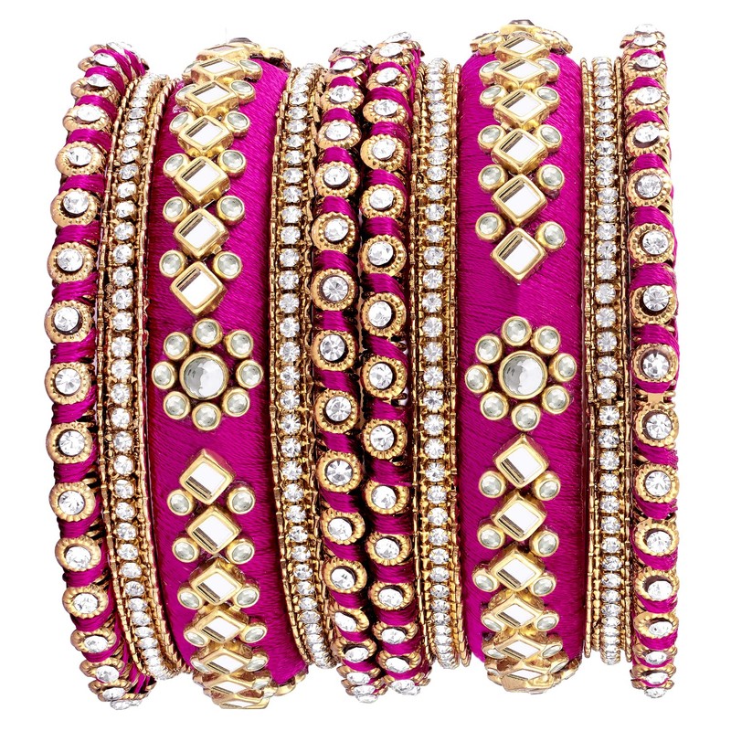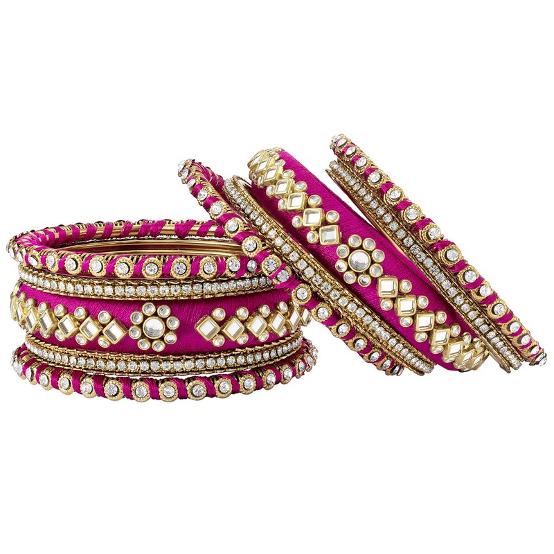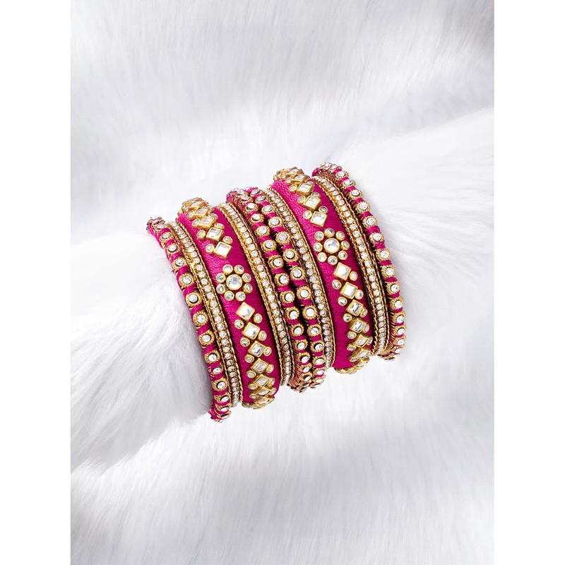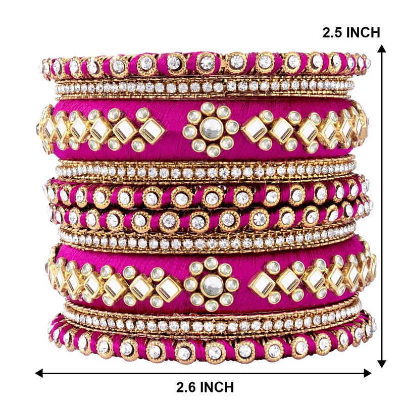 Aheli Velvet Matching Fancy Silk Thread Rani Pink White Chuda/Chura Bangle Set Gift for Women Size 2.6"