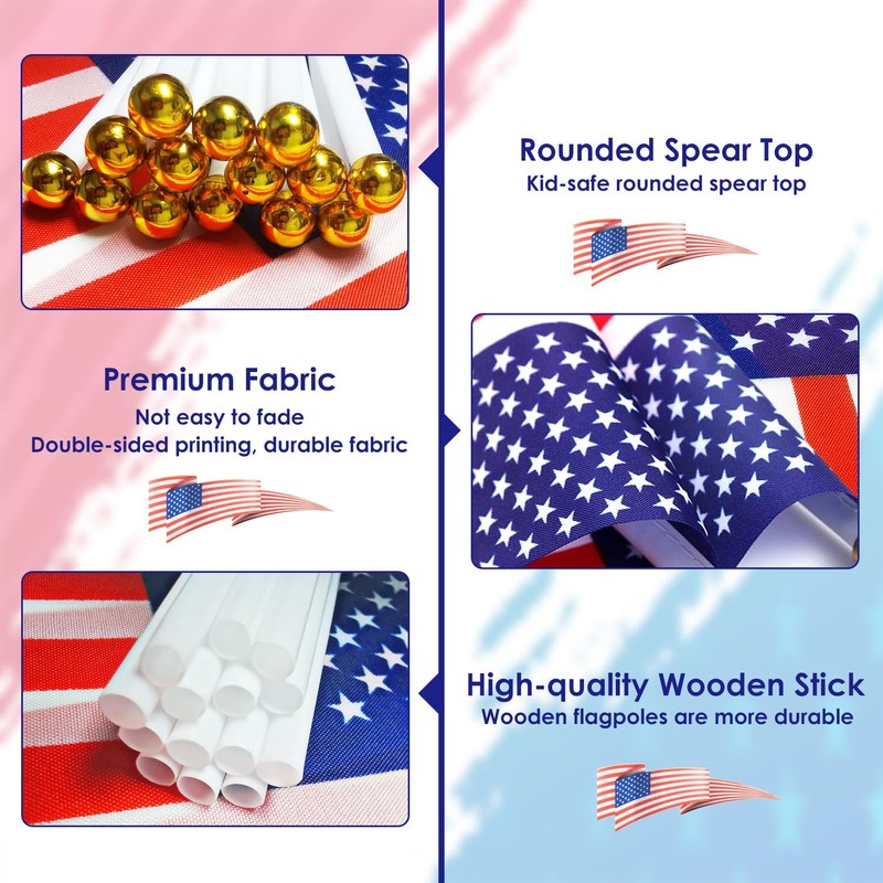 - 【Wide Application】: The small US flags on sticks can be used for 4th July Decorations, Veterans Day, Memorial Day and Olympic party decorations to show your pride in America.