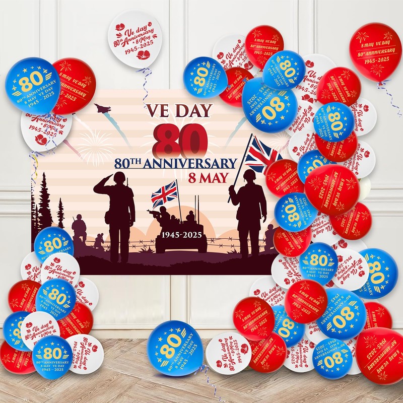 - 【SPECIFICATION】: This package includes 1pcs Large VE Day 80th Anniversary banner flag and 5pcs blue balloons, 5pcs white balloons and 5pcs red balloons. Measuring 150 x 90 cm, this banner features copper grommets at each corner, allowing for quick and secure installation. These products can be well prepared for 2025 Victory in Europe Day decor.