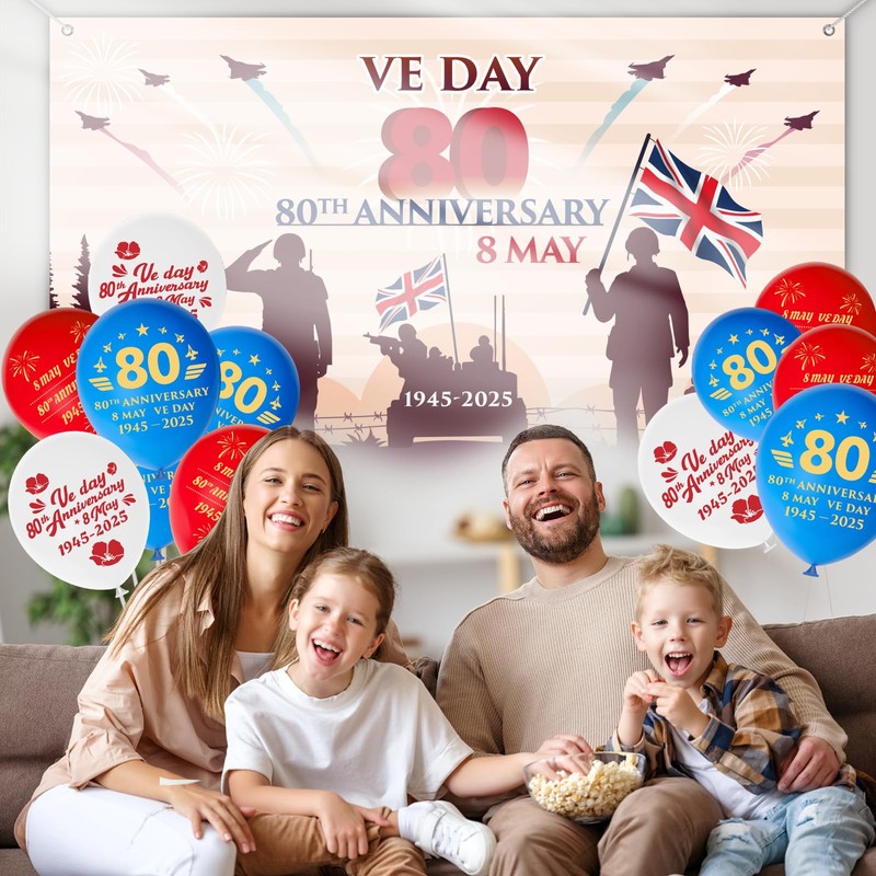 AhfuLife VE Day 80th Anniversary 2025 Backdrop Banner Set, 150 x 90cm Large Banner with 15Pcs VE Day Balloons for 80 Years VE Day Decorations Memorabilia Flag (150 x 90 cm)