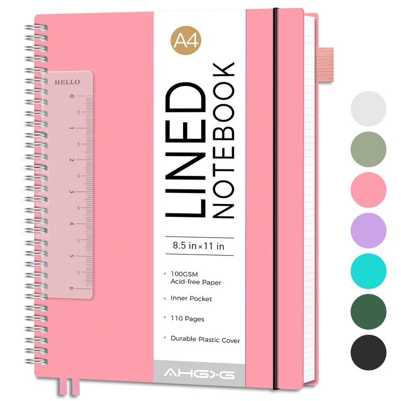 AHGXG Lined Spiral Notebook 8.5" x 11", A4 Large Notebook Journal for Women Men, 110 Numbered Pages College Ruled Notebook, 100 GSM Paper, Waterproof Plastic Cover, for School Work Note Taking, Pink