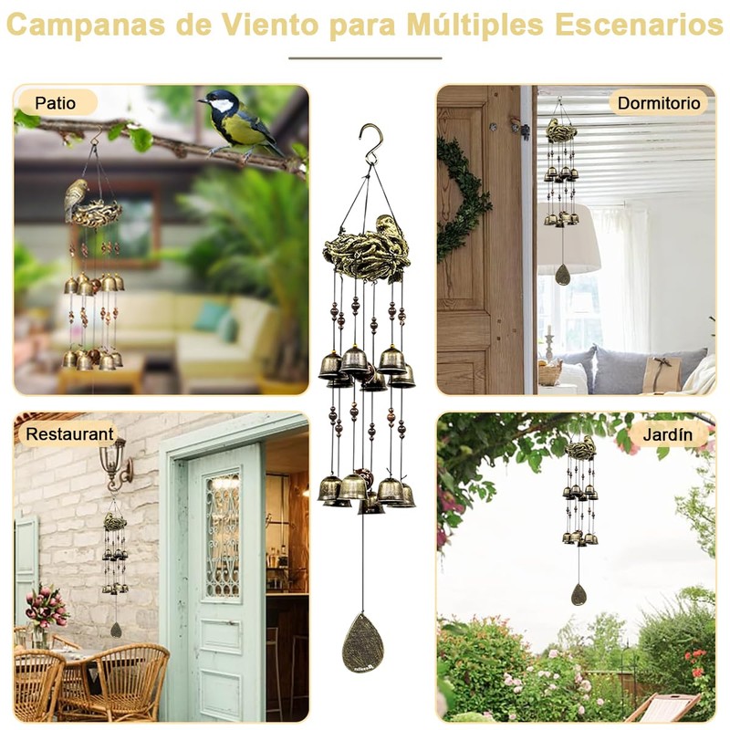 - 【Tono suave y sutil】 El viento mece las campanas, que suenan dulces, nítidas y encantadoras. Nuestras campanas de viento únicas ofrecen tonos ricos y relajantes. Nuestras exclusivas tiembres de viento emiten un sonido nítido y cadencioso que llena su entorno de una atmósfera agradable. Nuestro nido de campanas de viento es perfecta para relajarse después de un día ajetreado.