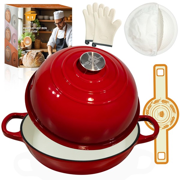 AHJ 6QT Dutch Oven For Bread Baking, Enameled Cast Iron Dutch Oven Pot with Lid, Multi-Functional Bread pan, Sourdough Baking Supplies with Proofing Basket, Cast Iron Bread Oven, Silicone Sling & Gloves.