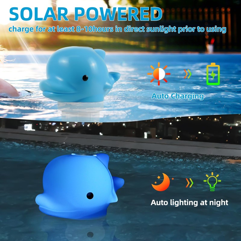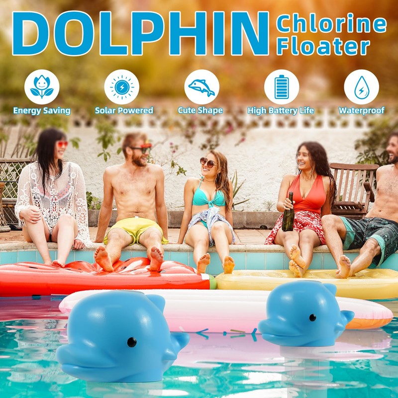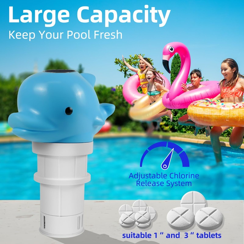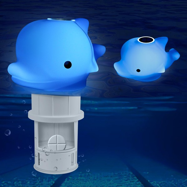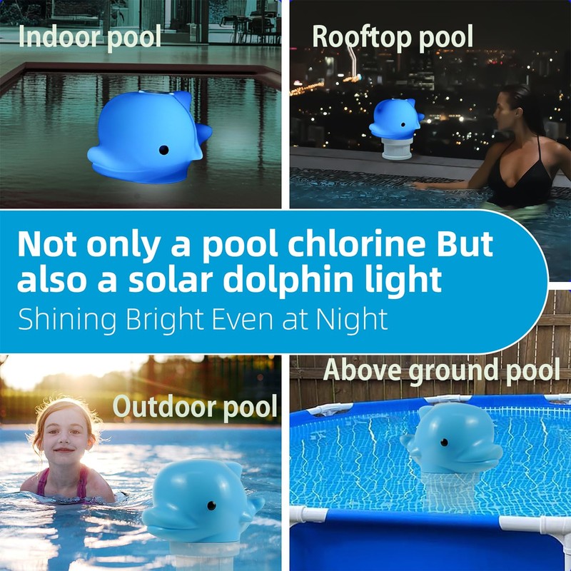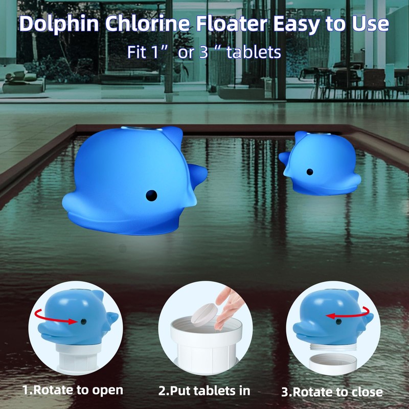 • ADJUSTABLE CHLORIN DELIVERY Our dolphin pool chlorine floater is extremely easy to use. Simply turn the switch to fill the five openings with Chlorine tablets. By turning the base, you can adjust the release rate in several levels to ensure the perfect balance for pools of any size and shape. The floater keeps the water crystal clear, while the adorable dolphin design with built-in lighting looks cool even during the day when it floats elegantly in the pool.