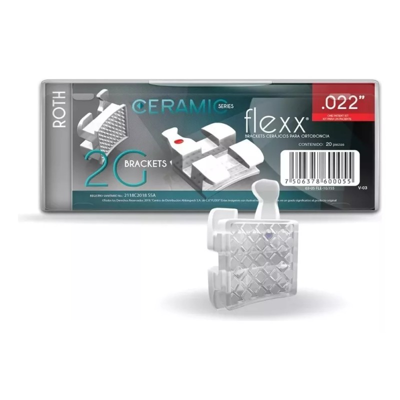 Bracket Ceramic Roth Flexx®. Bracket estético de cerámica poli cristalizada con una pureza de 98.8%. Elaborado de una sola pieza con tecnología especial de sinterización que incrementa la fuerza y la resistencia del bracket, otorga una textura de cristales con efecto invisible. Su diseño es anatómico, ergonómico y aerodinámico que asegura la comodidad y estética del paciente