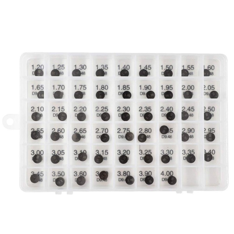 - Specification: 52/1 box valve shim; diameter: 9.48 mm, thickness: from 1.20 mm to 3.50 mm in increments of 0.05 mm; from 3.50 mm to 4.00 mm in increments of 0.10 mm