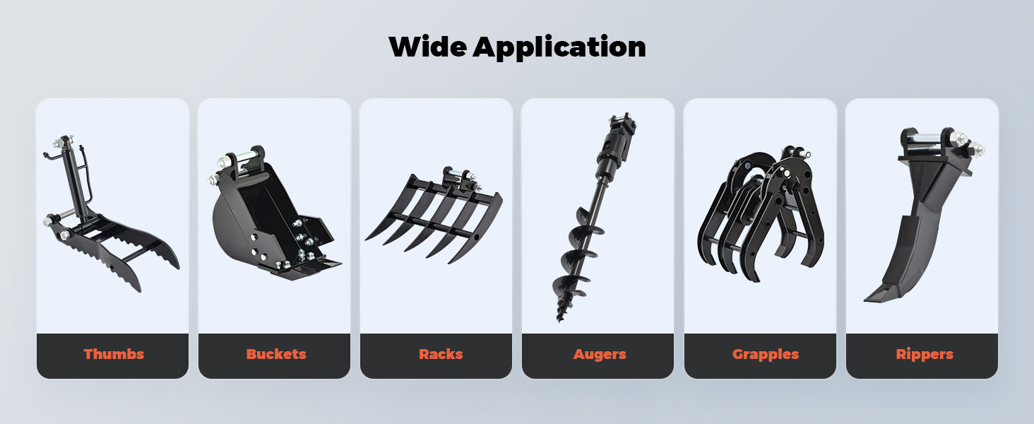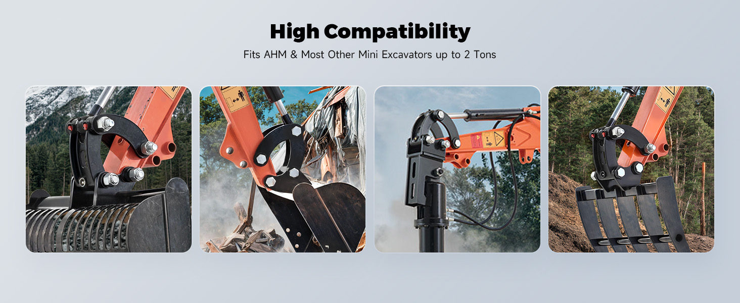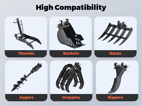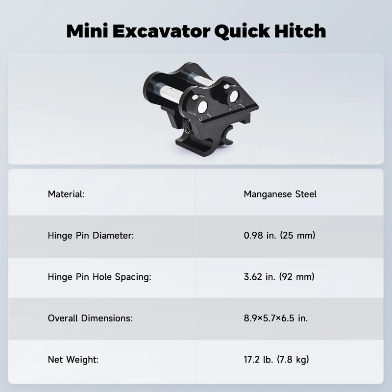 Wide Applications: This quick-change hitch enhances your mini excavator's versatility and productivity, allowing for easy connection to various attachments. It's ideal for applications such as construction, landscaping, demolition, agriculture, and more