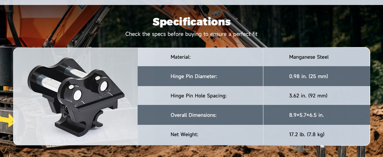 Built for Tough Jobs: Made from high-hardness manganese steel, this quick change connection is engineered for durability, making it reliable to connect with most heavy mini excavator attachments