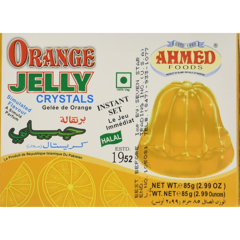 Ahmed Orange Halal Jello Crystal Jelly, 2.99oz. 100% Halal, gelatin-free. Original from Pakistan. Net Weight: 2.99oz (85g).