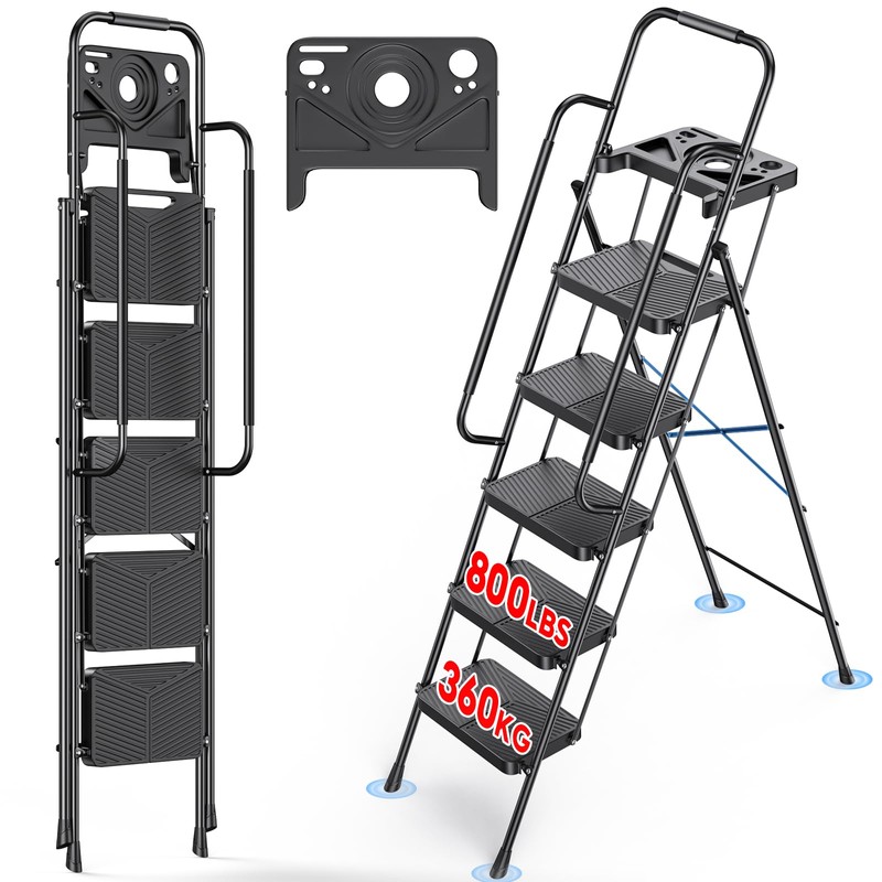 AHOMSEL Step Ladder 5 Step Folding,Step Ladder with Handrails,800 LBS Portable Safety Ladder with Safe-Lock Tool Platform Design,Suitable for Home, Kitchen, Office, Outdoor