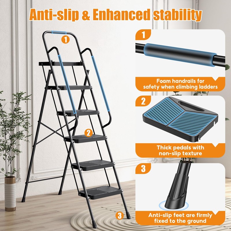 SAFETY HANDRAILS: New non-slip handrails on the left and right side of the ladder, wrapped with a comfortable sponge to give more balance when climbing the ladder, and can be used by the elderly with peace of mind