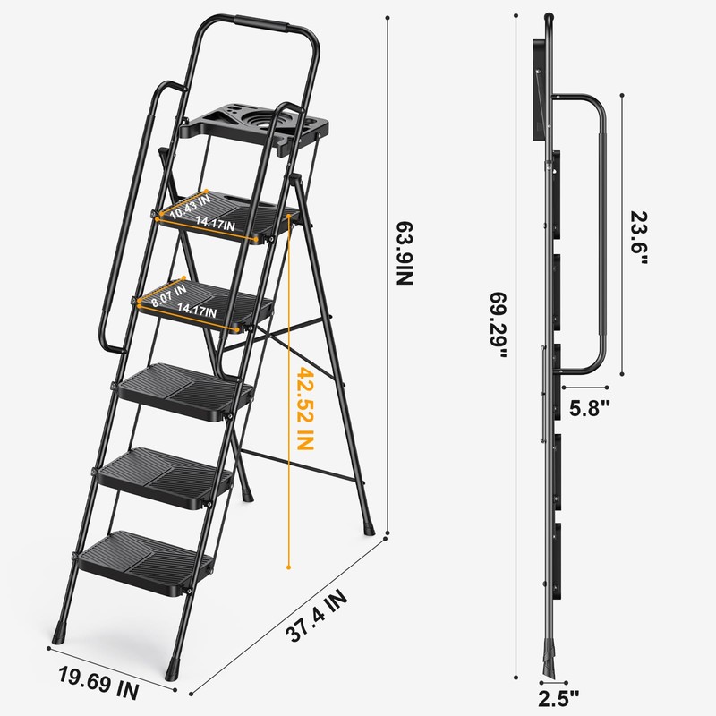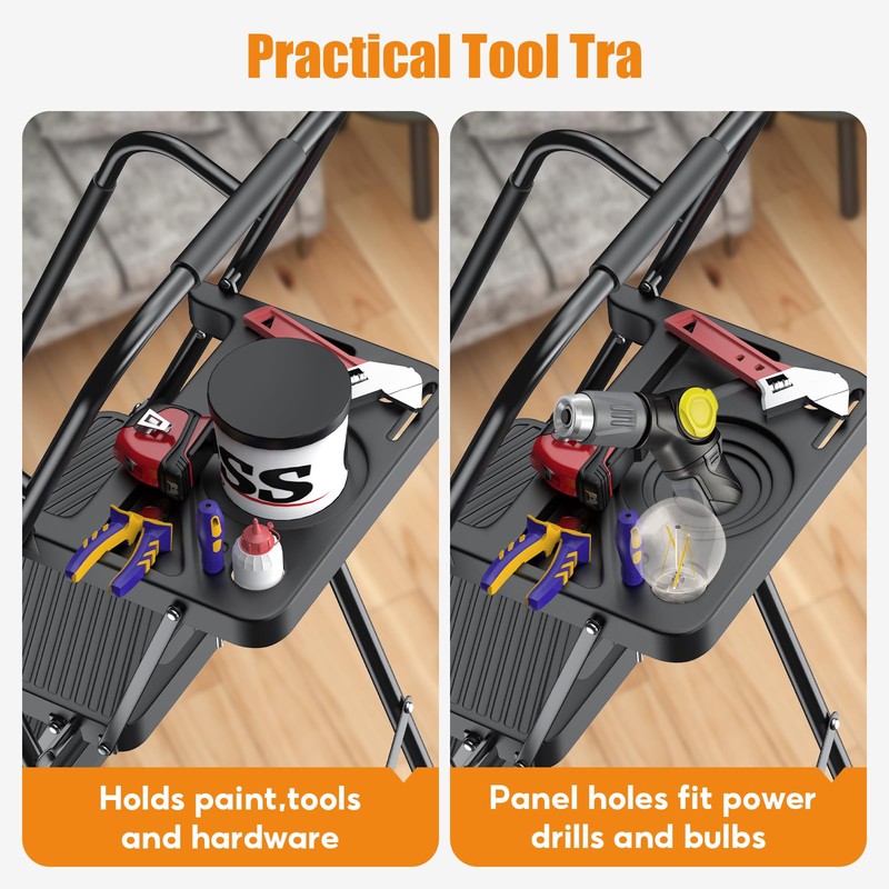 - Convenient Tool Platform: This collapsible 5-step ladder comes with a useful tool tray for gloves, wrenches, paint cans, light bulbs and more. With the ladder tool tray within easy reach, you can quickly access your tools without having to climb up and down the ladder, thus increasing efficiency and saving energy on the job. It's perfect for home improvement, painting, repairs and more.