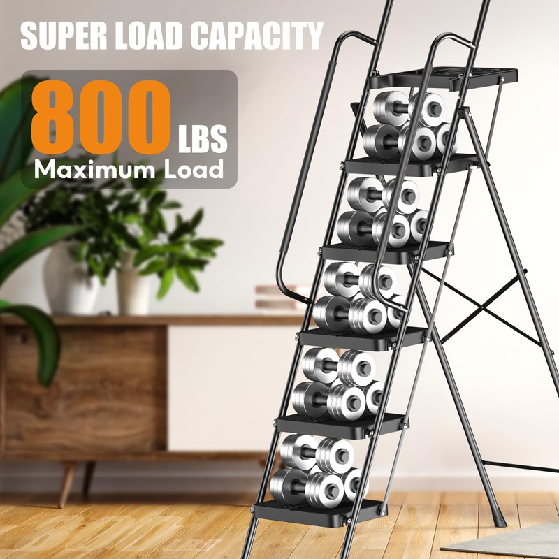 - Ladder Size & Load Capacity:This folding ladder meets the needs of most homes and is also essential for changing light bulbs, cleaning ceiling fans, hanging Christmas tree hangings and more. Measures 19.61"L x 37.4"W x 63.9" H when open and 19.61"L x 5.8 "W x69.3"H when folded. Maximum weight capacity: 800 lbs.