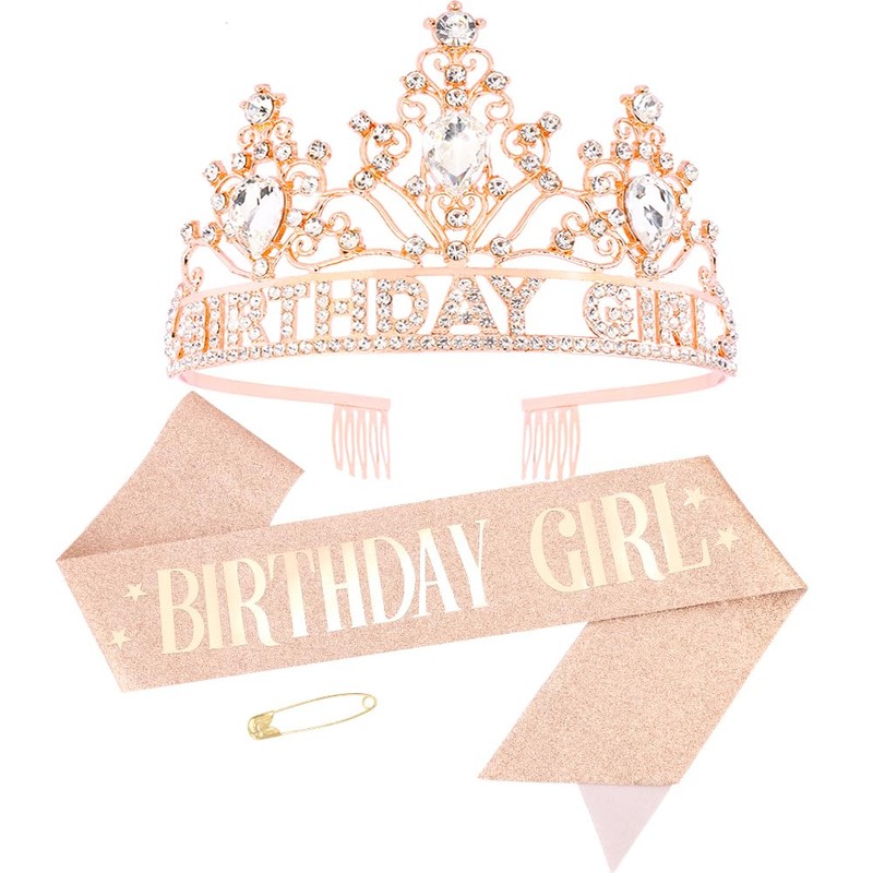 AHONEY Birthday Girl Crown and Sash for Girls Women Rose Gold Tiara Rhinestone Headband Princess Crown Happy Birthday Accessories
