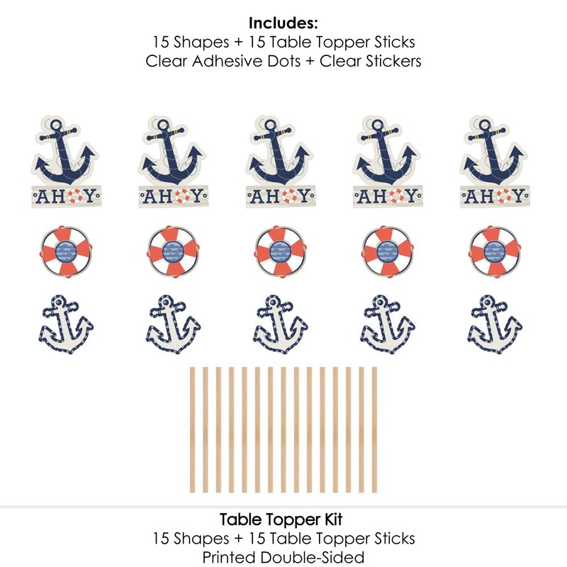 - Ahoy - Nautical Centerpiece Sticks INCLUDES 15 Ahoy - Nautical table toppers in three different shapes, 15 table topper sticks and stickers for easy assembly. Anchor party table decorations are perfect for a baby shower or birthday party.
