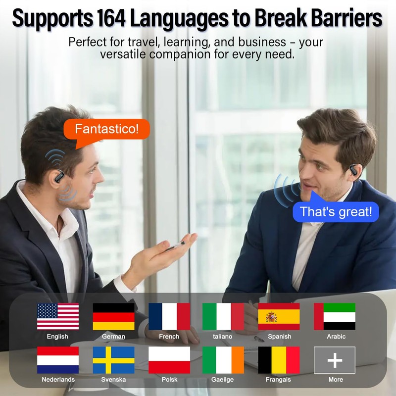 - Supporting 164 Languages, no subscription needed & 7 Translation Modes: The language translation earbuds is equipped with an AI intelligent translation engine, has 7 translation modes, and supports instant translation between more than 164 languages. Headphone mobile phone mode; simultaneous interpretation mode; text mode with camera recognition; dual headset mode; audio and video call mode; recording mode; AI dialogue mode. Whether it is a business meeting or a cross-border friendship, barrier-free communication can be achieved.