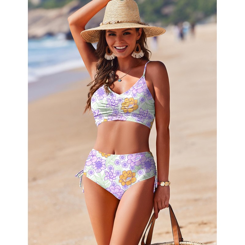 - High waisted drawstring two-piece swimsuit: The high waisted swimsuit adopts a high waisted tummy control design, and the drawstring bow design on both sides of the swimming trunks is fashionable