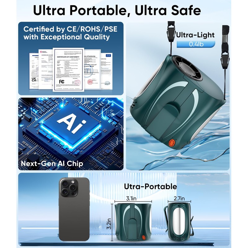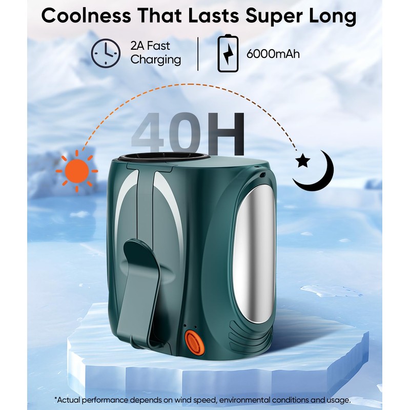 - [Extended Runtime & Fast Charging] Equipped with a 6000mAh industrial-grade battery, this personal fan delivers 10-40 hours of uninterrupted cooling on a single charge. Built-in the latest AI smart safety chip, and passed multiple security certifications such as CE/FCC/RoHS, providing you with a safe cool breeze.