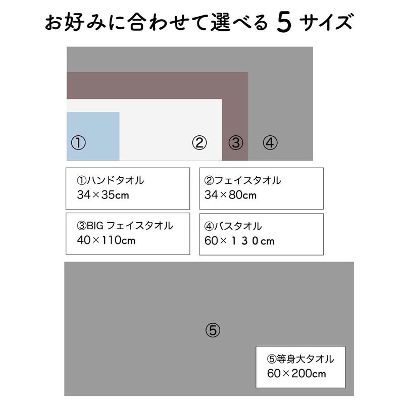 - Size: Hand Towel: 13.4 x 13.8 inches (34 x 35 cm), Face Towel: 13.4 x 31.5 inches (34 x 80 cm), Big Face Towel: 15.7 x 43.3 inches (40 x 110 cm), Bath Towel: 23.6 x 5.2 inches (60 x 2 x 2 inches (20 cm)