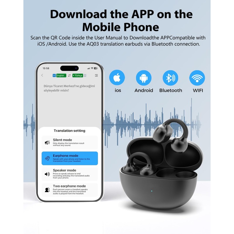 • [3-in-1 Functionality and HiFi Sound]: AQ03 wireless bluetooth translation earbuds integrate translation, music playback, and phone calls, providing versatility and convenience for work and daily life. HiFi Sound, delivering clear music and calls in any situation.