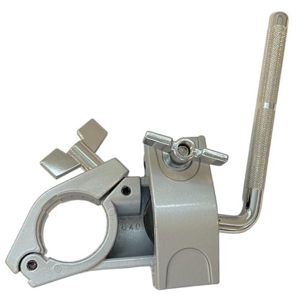 Drum rack mount with 1.5" clamp and rotating L rod (10.5mm) Designed to mount cowbells, tambourines, jam blocks, or 10.5mm toms and e-drum pads Adjustable clamp accommodates various sizes without disassembling the drum rack Rotating ball joint enables precise positioning Can also be used as a mount for electronic drum pads
