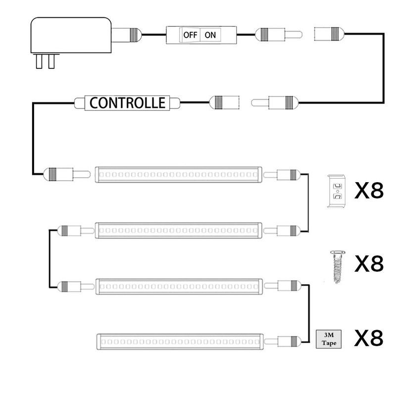 **A bright LED under cabinet kitchen light bar kit with dimmable switch, easy install, energy saving and safe to use.** **@ SPEC:** Color: Warm white(3000K) Energy Saving: 3W, equal to 30W halogen, incandescent and fluorescent cabinet light. Lumen: 300lm per cabinet light CRI: >80 Size: L:11 X W1 X H 0.32 inch Extension Cable: 5.9 inch and 20 inch Adapter cable: 80inch, Power Adapter Connector: 12 inch Material: Aluminum **@FEATURES:** SAFE TO USE: UL listed power plug, 12Vdc output. EASY TO INSTALL: You can either use 2 sided tapes or screws to install in wherever it fits. ENERGY SAVING: 3W LED is to replace 30W halogen under cabinet lights, >90% electricity bill saving. LOW PROFILE STRIP LIGHTS: Only 0.32 inch thick, almost invisible after installing the slim led under cabinet lighting. DIMMABLE: By using a dimmer switch, the led cabinet kitchen light bar can be used for dimming from 0% to 100%. Plus there is another On/Off switch inline with the transformer, the dimming function can be remembered FLEXIBLE TO CONNECT: There are 2 different connection cables included, one is 5.9 inch, the other is 20 inch. Therefore the under cabinet lights can be connected according to different distance. **@ PACKAGE INCLUDED:** 4 x LED under cabinet kitchen light bar 1 x power wall plug 1 x dial dimmer switch 1 x DC connector 3 x connection cable (5.9 inch) 3 x connection cable (20 inch) 8 x double sided adhesive stickers 8 x screw mounting bracket 8 x screw 5 x cable arrangement clips **@ REMOTE CONTROL:** Should you need a remote control, please refer to the ASIN #B01M7TGZ9B, extension cable refer to ASIN B07J5XP2D3 **APPLICATION** This linear lighting is perfect used as accent display cabinet lighting,kitchen lighting,counter lighting,worktop lighting,under cabinet lighting,gun safe lighting,workbench lighting etc.