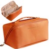 AICase - Travel Makeup Bag, Large Capacity Cosmetic Bag for Women, Leather Waterproof Portable Bag, Open Flat Toiletry Bag, Make Up Organiser with Divider and Handle, Brown, brown, Simple