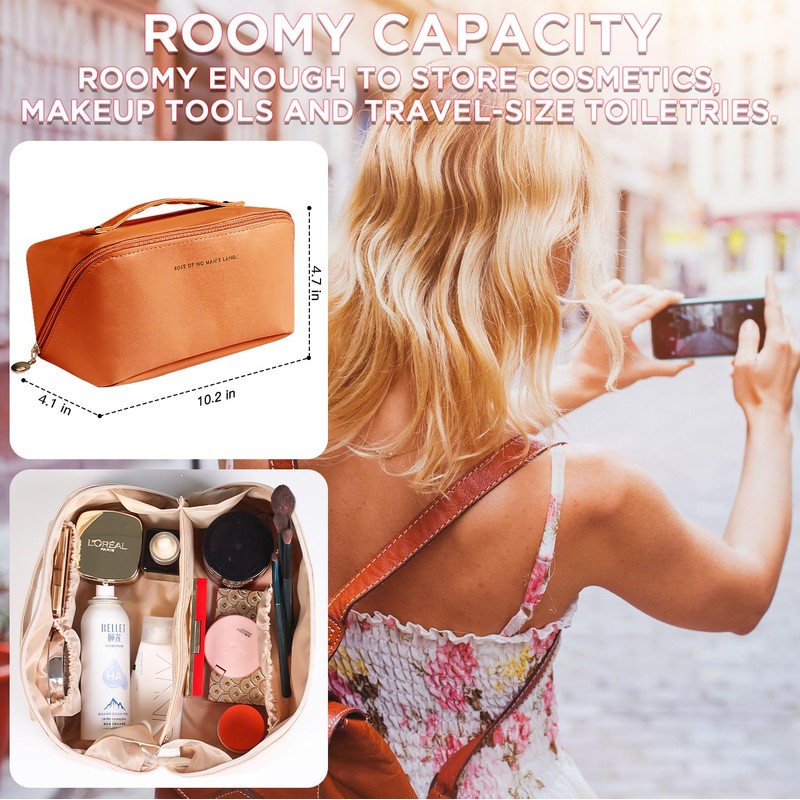 - The meaning: measure 9.25 x 4.13 x 4.33 inches and our make-up bag has a spacious opening that is perfect for your personal travel. Our large capacity cosmetic bag is equipped with multiple compartments and compartments that are large enough to hold a variety of cosmetics, make-up tools, toiletries and valuables, etc.