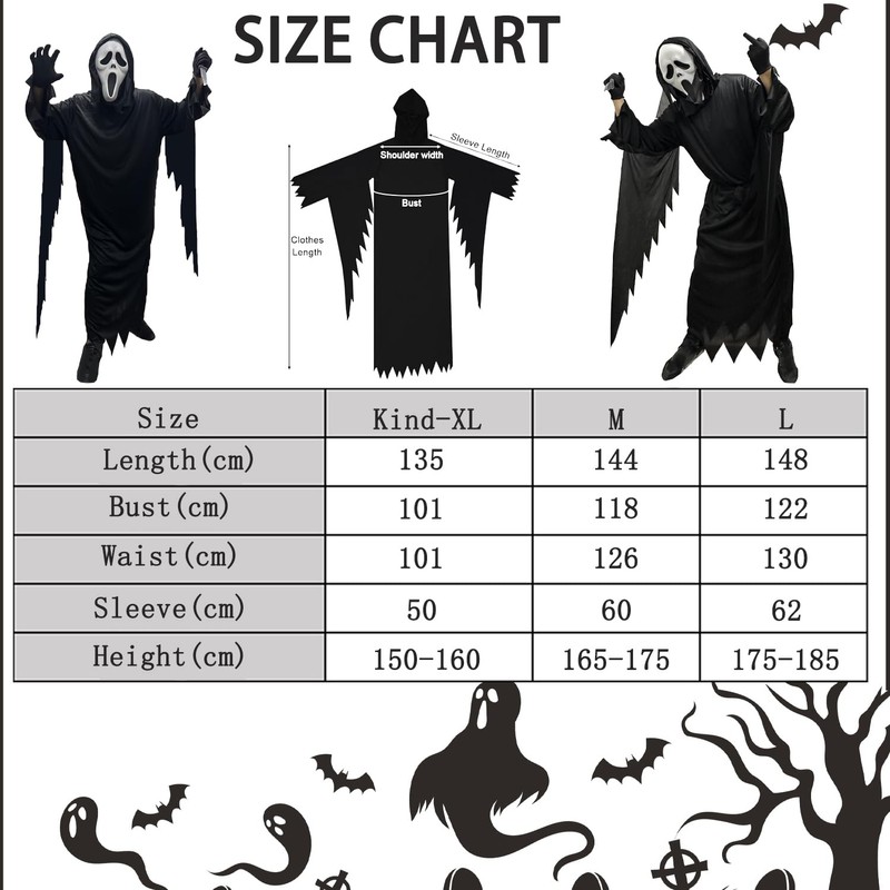 - Style size: this Halloween scream costume is available in 3 sizes: XL for big children and M and L for adults.